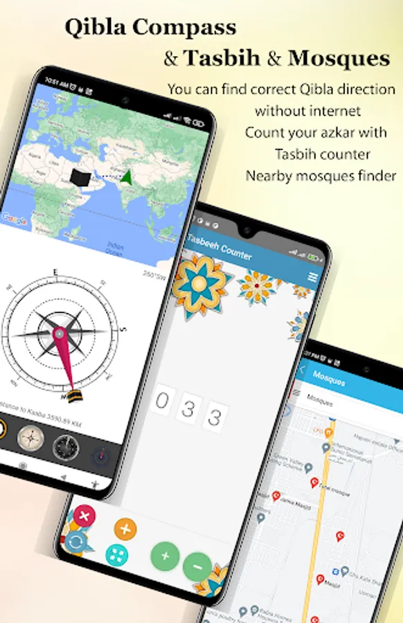 Qibla finder, compass and Qibla map, guiding you to the direction of Mecca. Make sure to always face the Kaaba during your prayers, even when you are not at home.