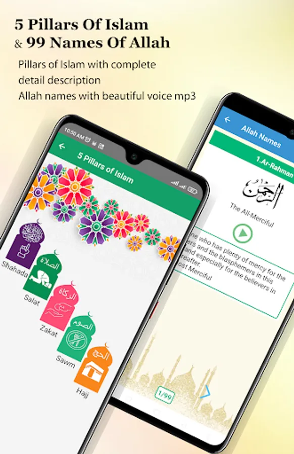 99 names of Allah (Asma-ul-Husna). It offers detailed explanations of each name with audio recitation.