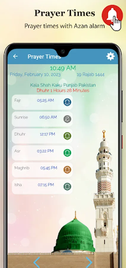 Visual and audio notifications for the calls for Prayer with voice Azan alarm.