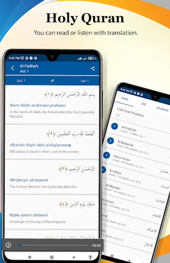 Also include audio Quran mp3, which can help users to improve their pronunciation and recitation of the Holy Quran.