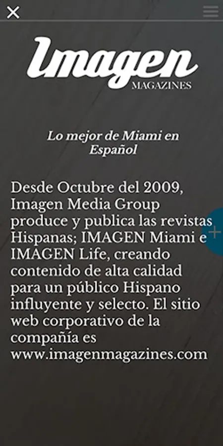 Desde Octubre del 2009, Imagen Media Group produce y publica las revistas Hispanas; IMAGEN Miami e IMAGEN Life, creando contenido de alta calidad para un publico Hispano influyente y selecto. El sitio we corporativo de la compañía es www.imagenmagazines.com