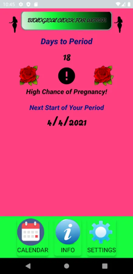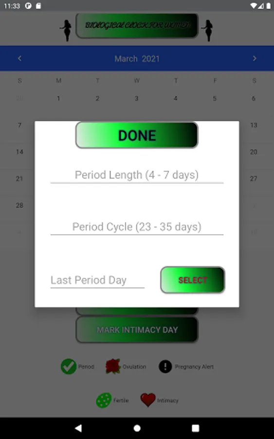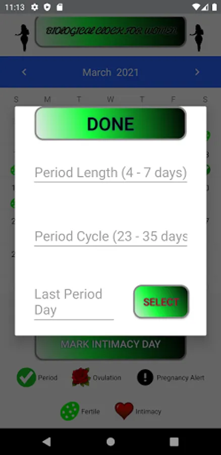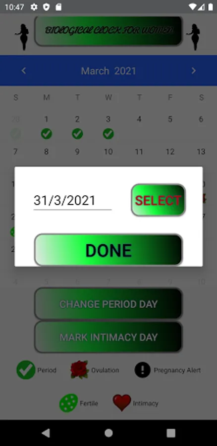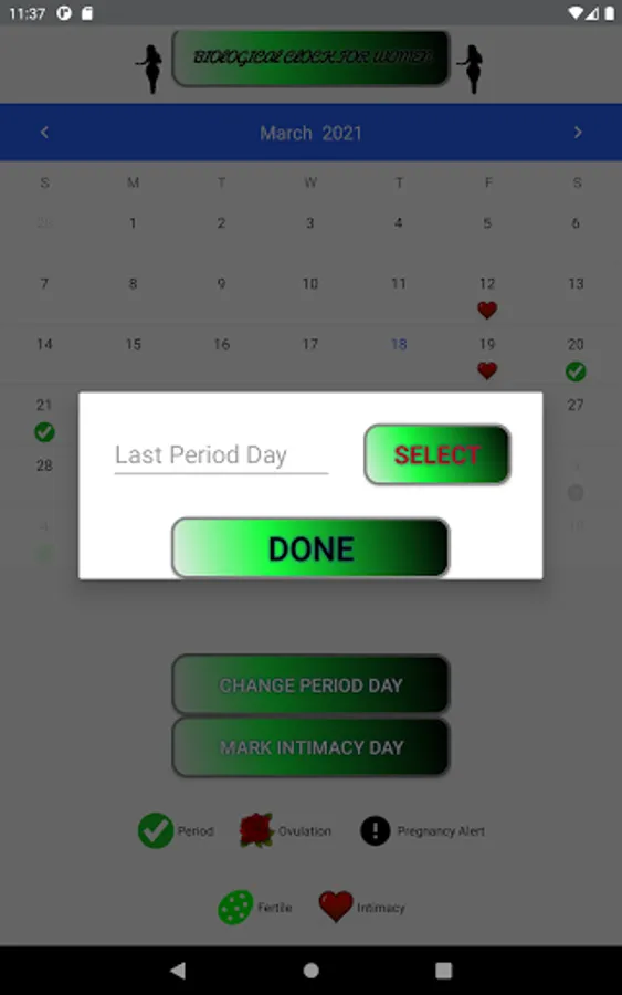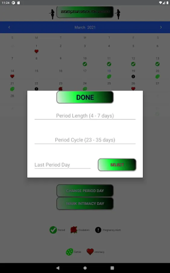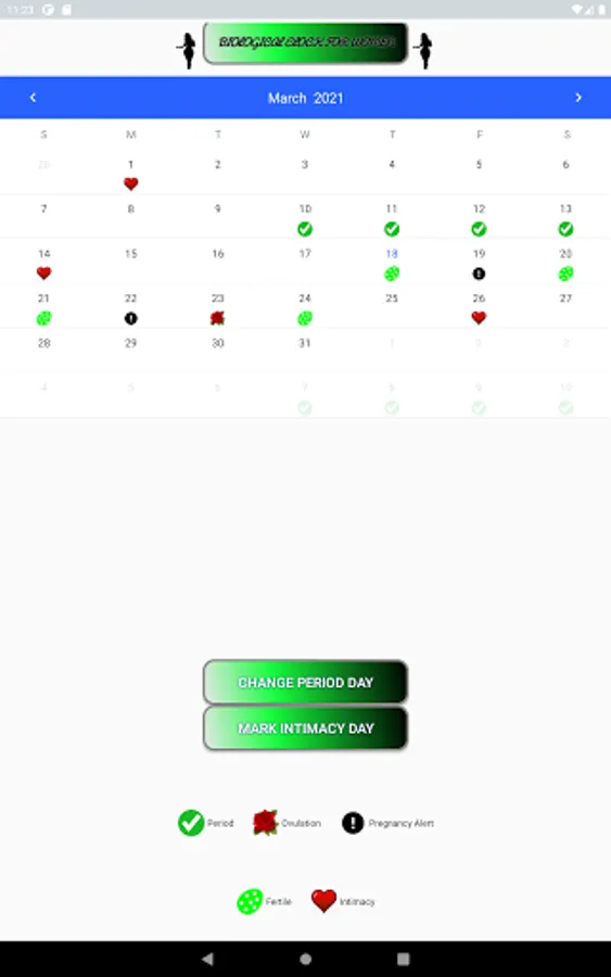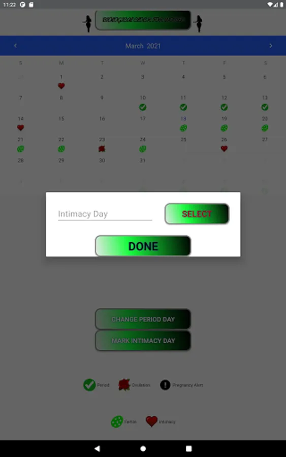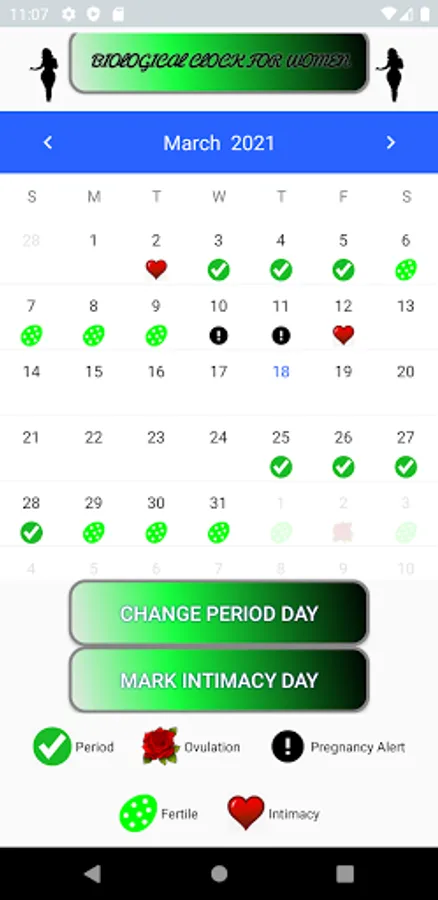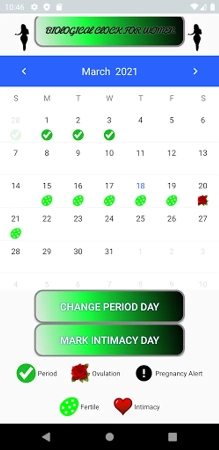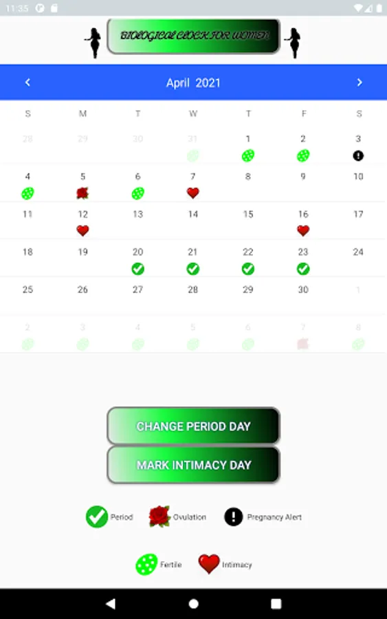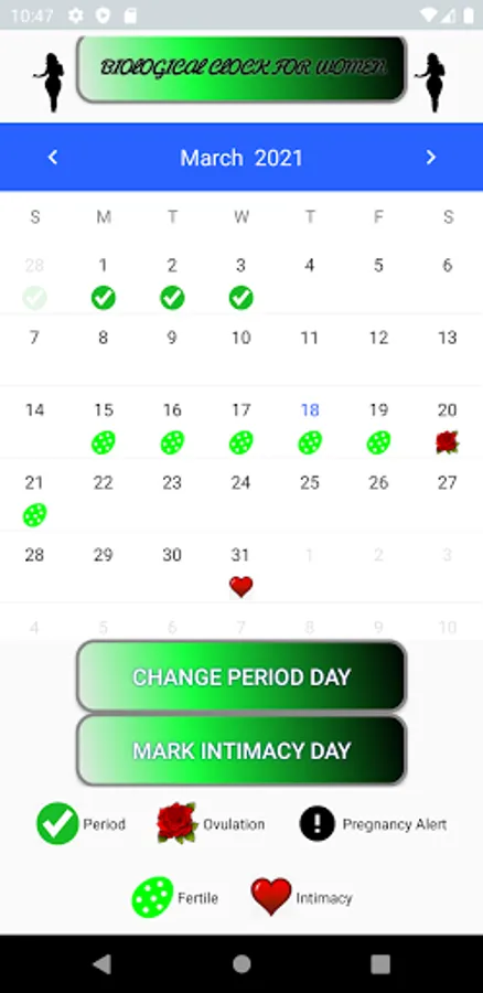 It also indicates your Pregnancy Chance with daily special alert for your fertile days an ovulation day on the home page. By using this period tracker you can also keep your records for intimacy with the help of its calender. It is useful to know your fertile days for increasing your Pregnancy Chance.