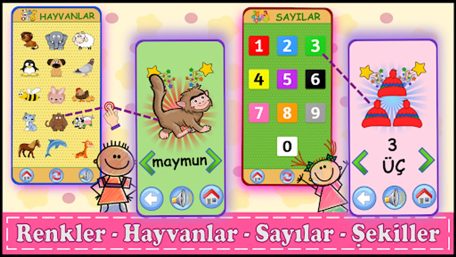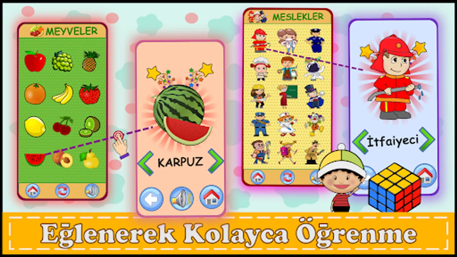 Application; Turkish is designed so that children can learn colors, numbers, letters (alphabet), shapes, animals, fruits, vegetables and vehicles with pleasure by contributing to their pre-school (kindergarten) education.
