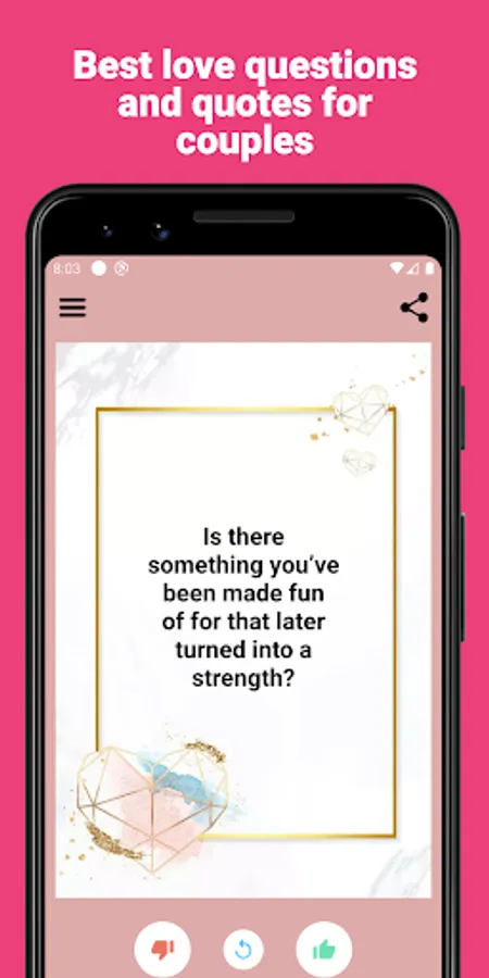 Conversation plays an important role in love life. In this application, you can find many special questions that will allow you to get to know each other and understand your feelings for each other.