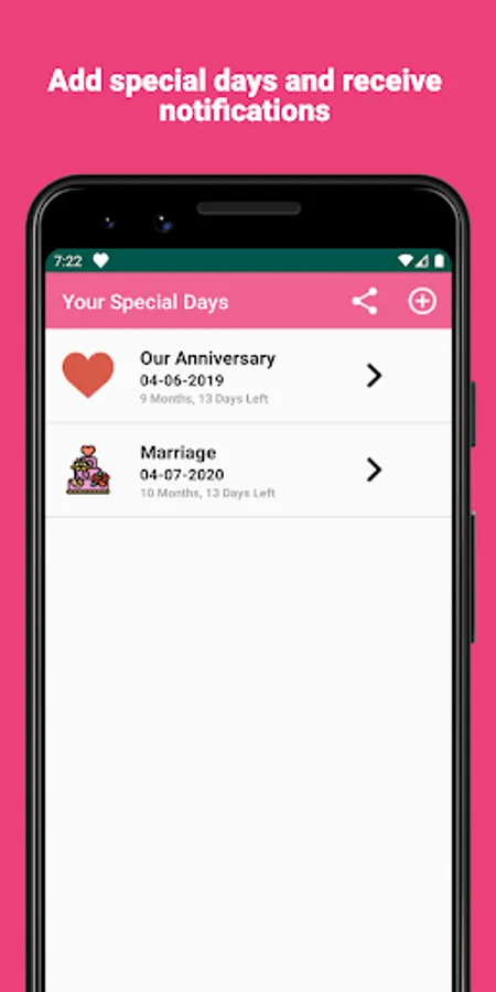 You can add your special days and get notifications with choosing reminder frequency option (daily, weekly, monthly, yearly).