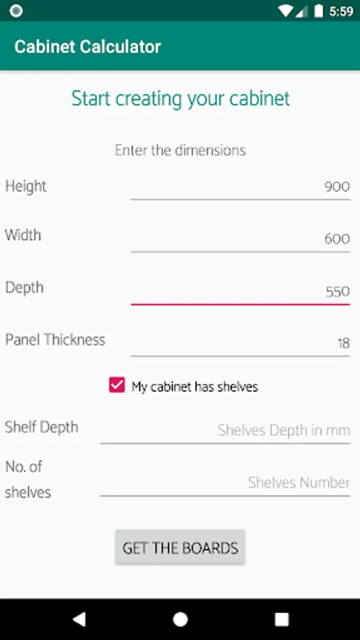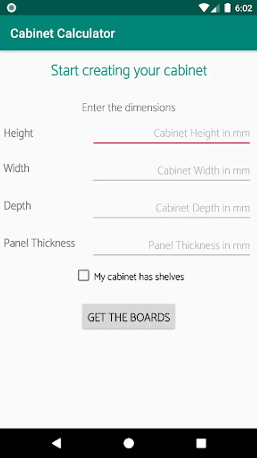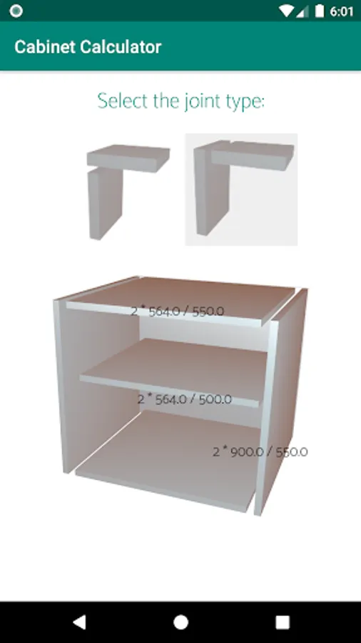 Cabinet Calculator is designed to calculate the dimensions of the necessary boards to build a simple cabinet. Just enter the dimensions of your required cabinet and Cabinet Calculator does the rest. You can also select between two joint types, on the sides or on the top and bottom.