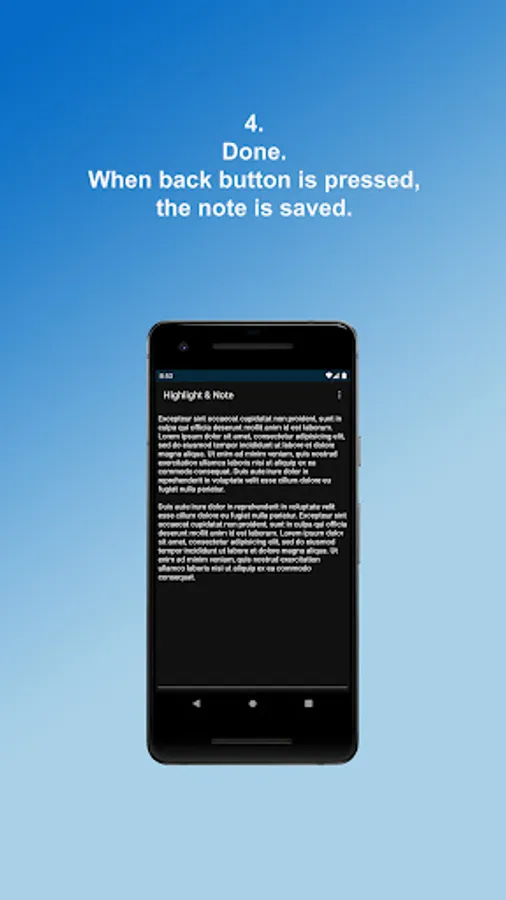 When the back button is pressed, the note is saved, the app ends itself and user turns to previous screen automatically . This configuration provides fast changeover between the article user read and the app. You can read, edit and delete the saved notes by opening the app.
