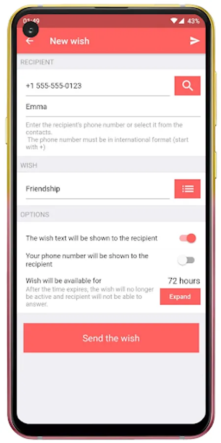 The wish is sent by phone number. The recipient will see the Wish, but will not know that it comes from you.