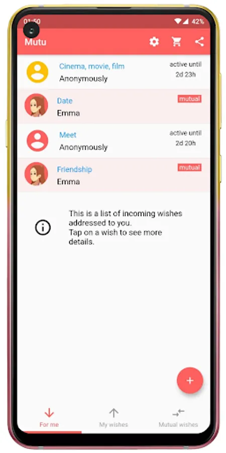 Often people are afraid to express their wishes and desires, fearing that they will not be mutual. With Mutu, you can test your desires for mutuality, without being afraid to voice them.