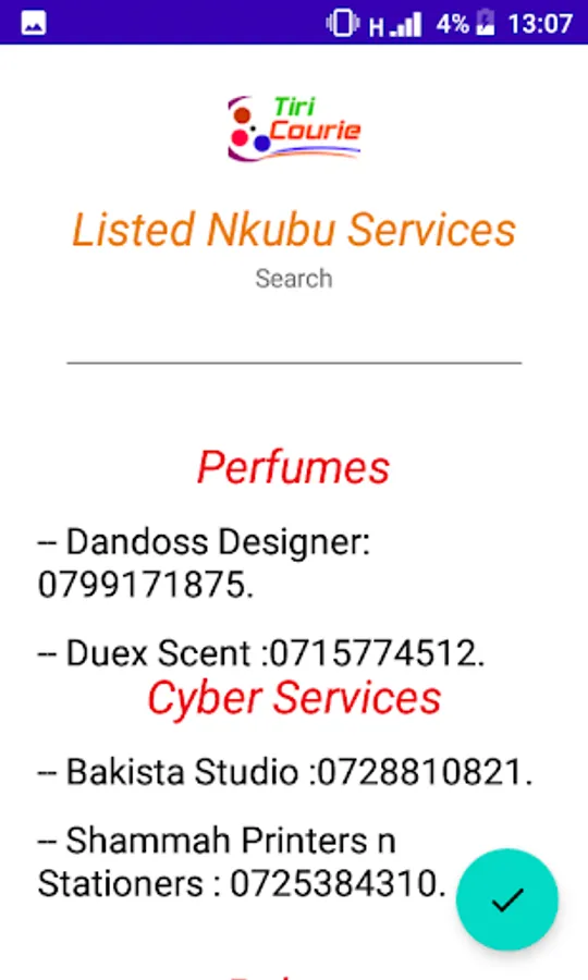 Tiry Connections is an app that is meant to connect customers to various service providers at the comfort of one's location. Upon visiting the app, you will search for the town of your choice and then you will search for the service you need in that particular town. You can then call the service provider for negotiations. It is simple to use and straight forward.