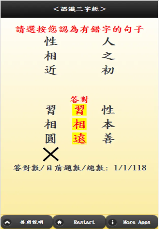 <認識三字經>共有118題(組),每題有四個句子,剛開始使用,從第1題開始,然後第2題,第3題..一直到最後一題,如果從第12題中斷,下次回到<認識三字經>或重新執行<認識三字經>還是從第12題繼續下去,如果想從第1題開始,可在畫面最下方的restart按鈕按一下,即可從第1題開始。