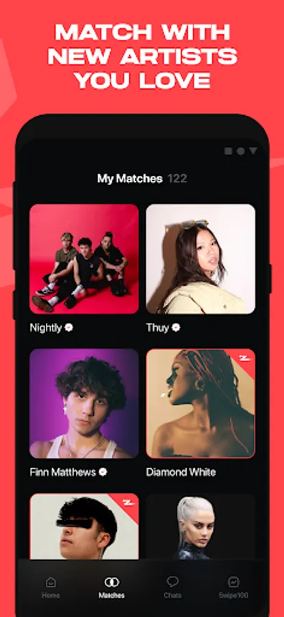- Swipe right 3-times to create a ‘match’ with new artists you’ve discovered.