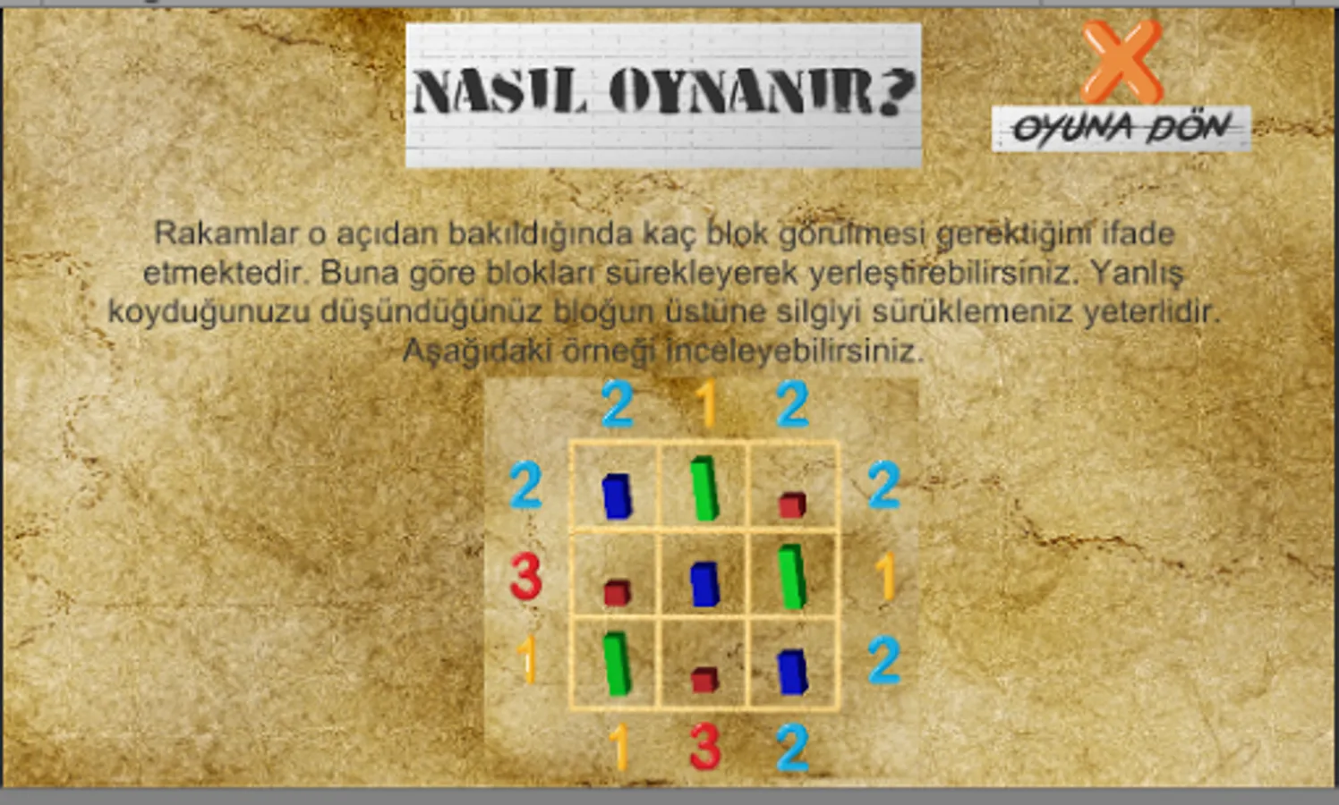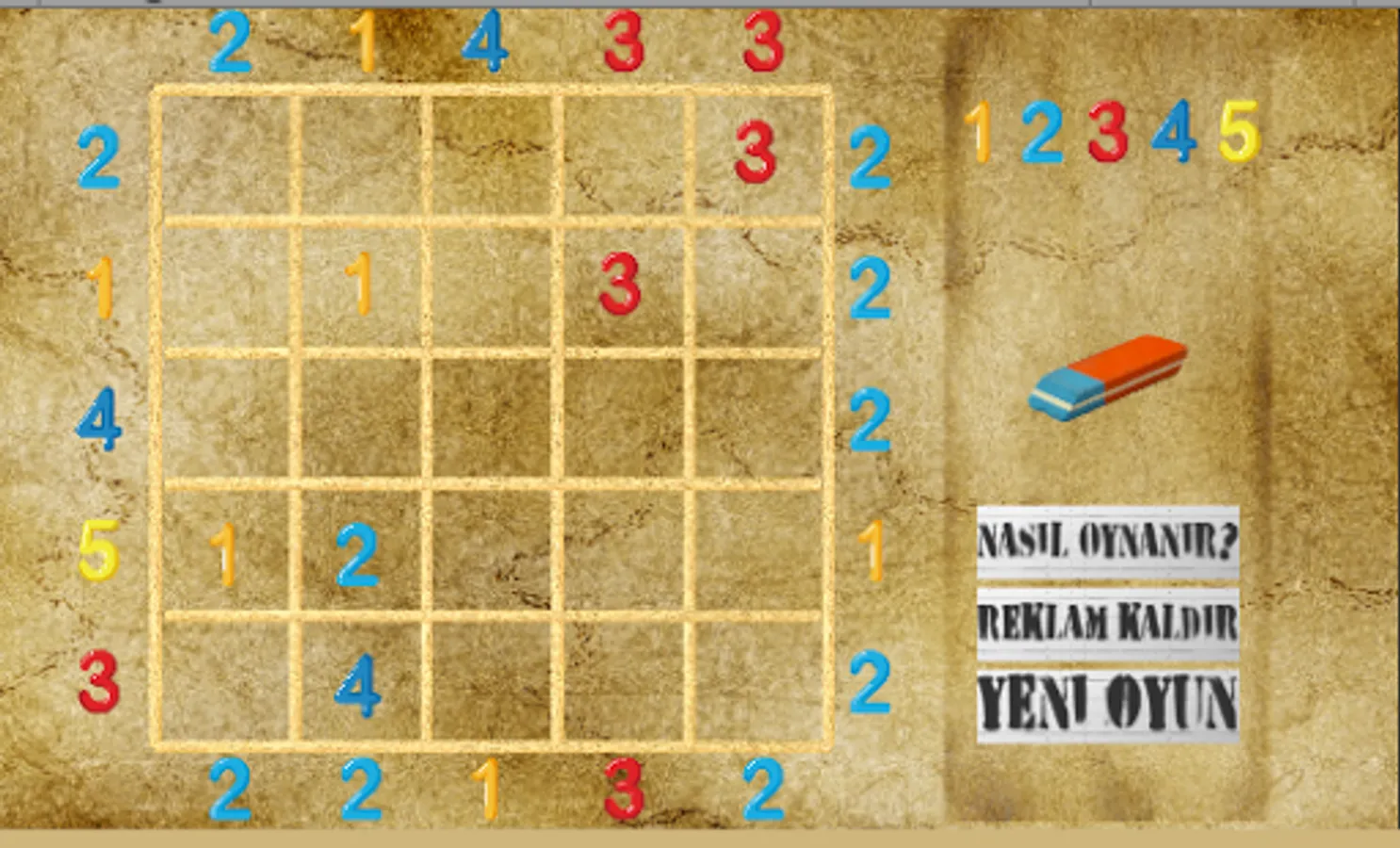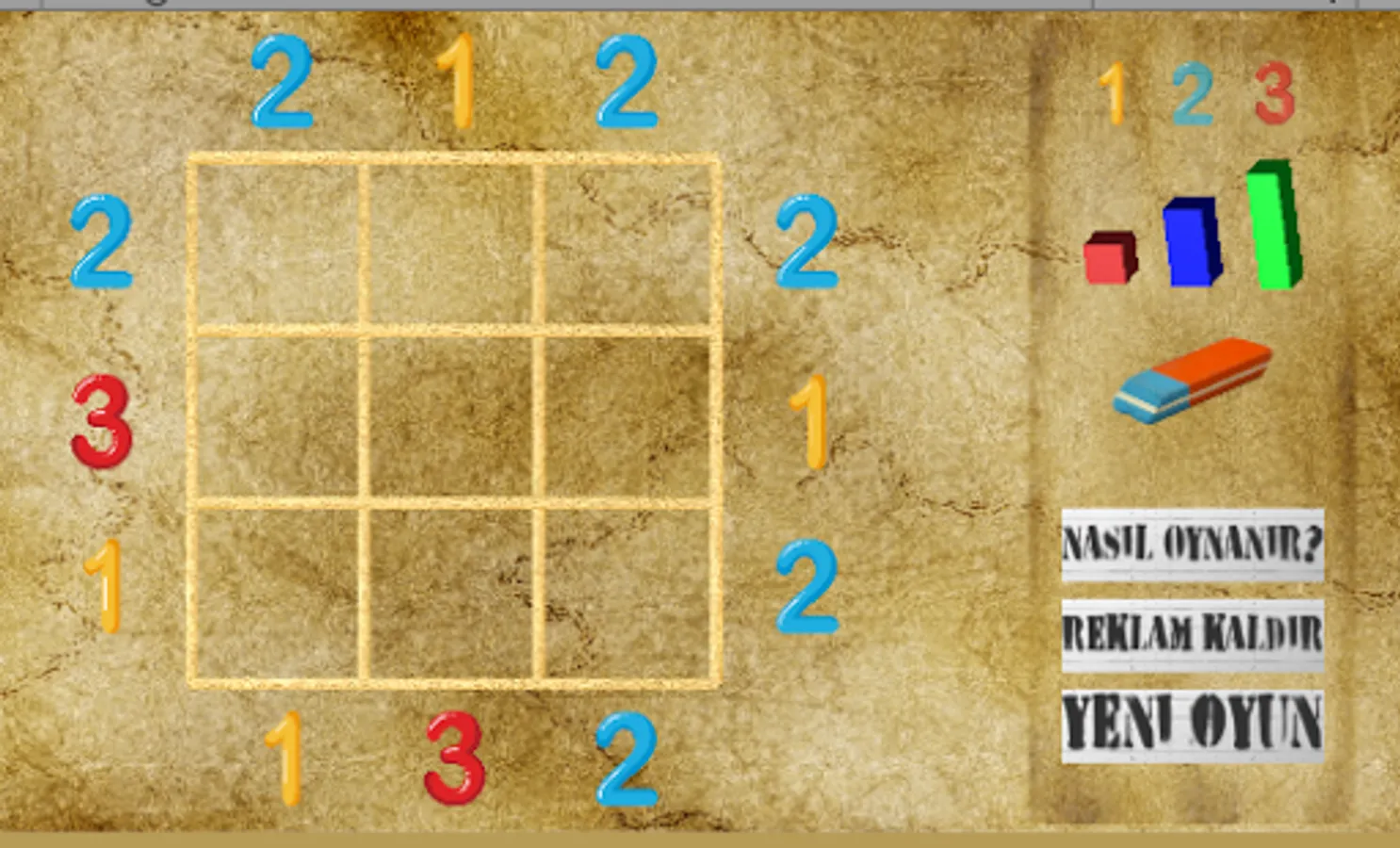 The fun of Sudoku! Each of the bars in the game represents an apartment. The game platform is filled with the question cards in each row and column in a way that the apartment buildings of different colors are once included. The numbers given outside the diagram give the number of apartments that cannot be seen behind a higher-rise apartment.