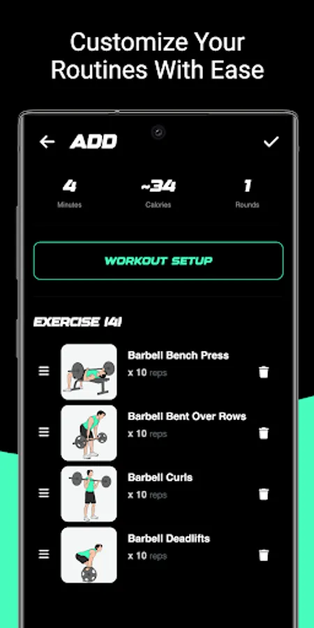 Creating a new workout is a breeze. Simply give it a name, select your preferred exercises, and adjust the duration, number of rounds, and rests for each. Once you're satisfied, save your workout and get ready to sweat!