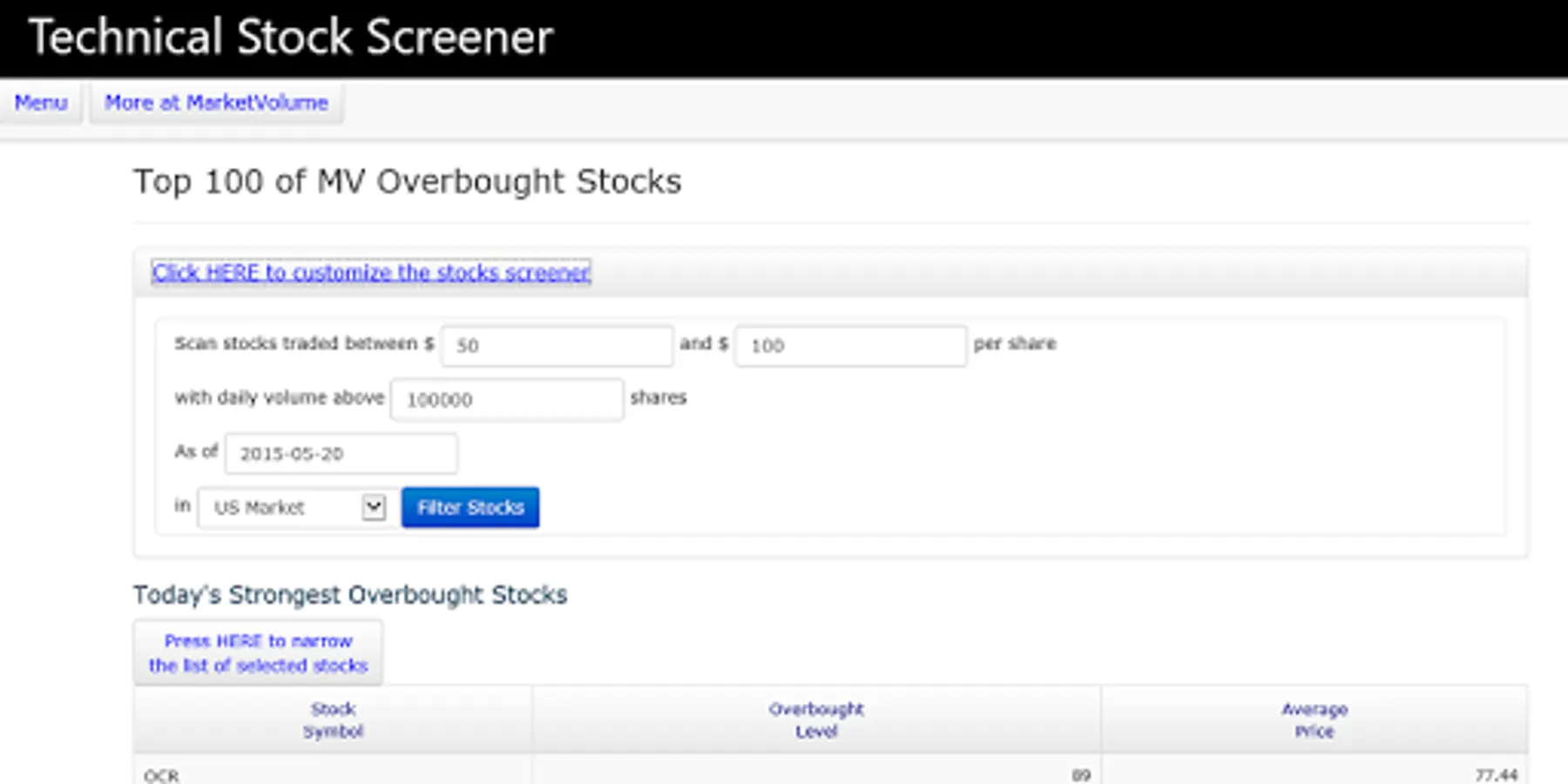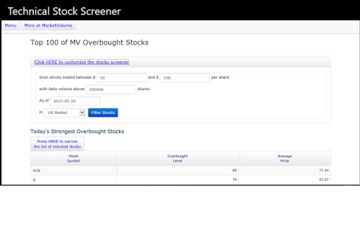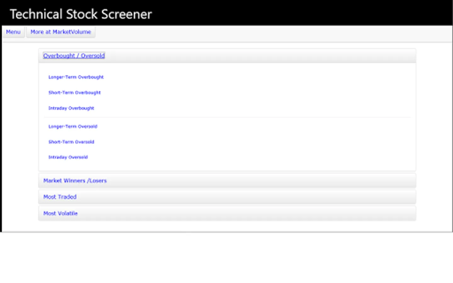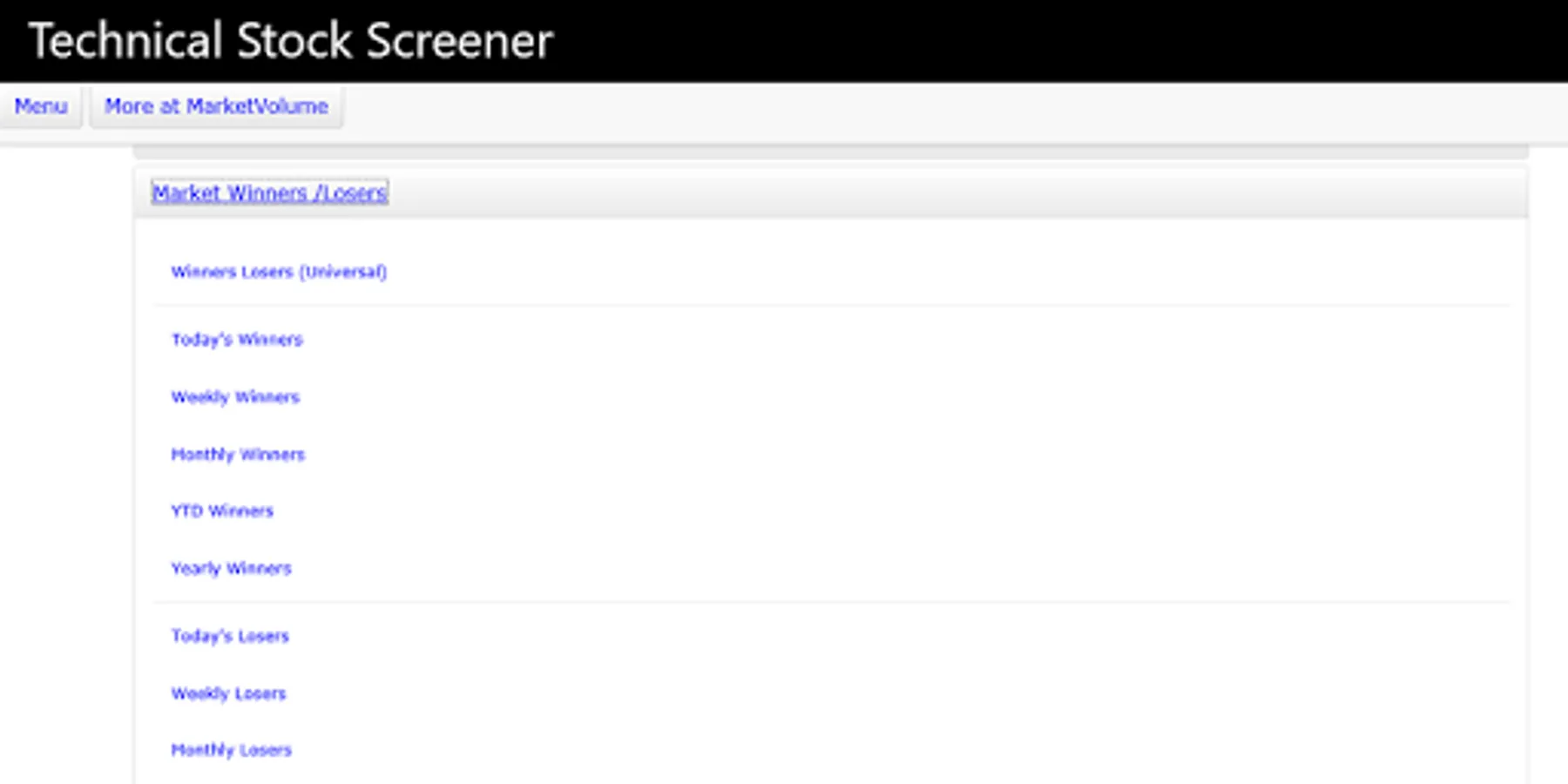 Technical stock screeners to scan the stock market and select stocks by specific technical criteria and indicators. The list of available stocks screeners includes: