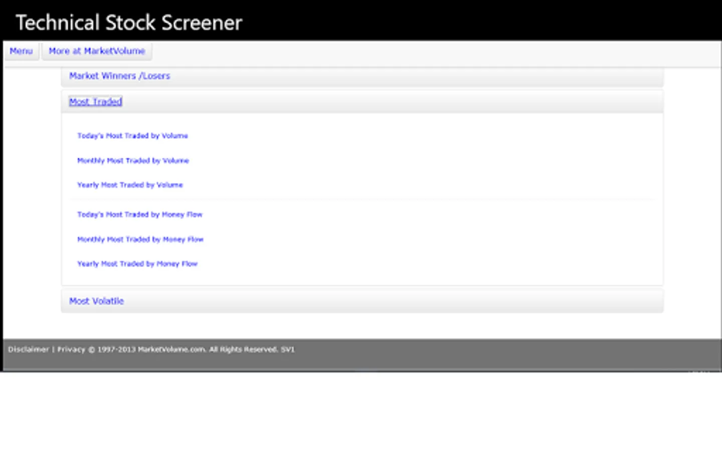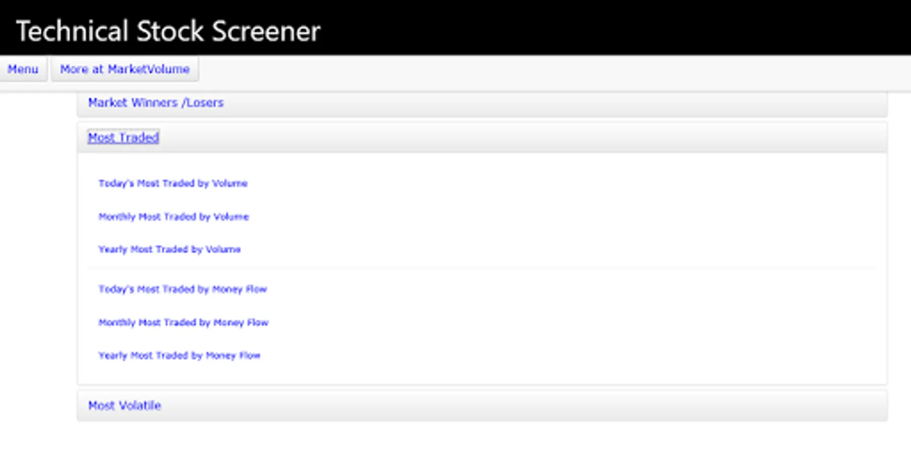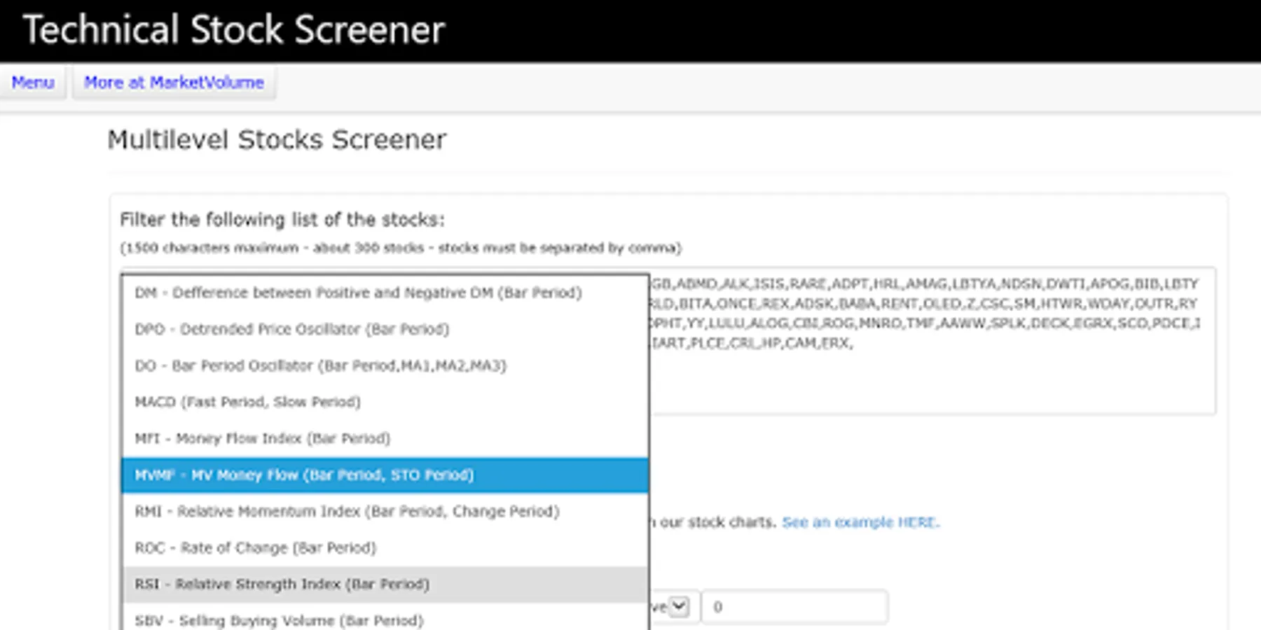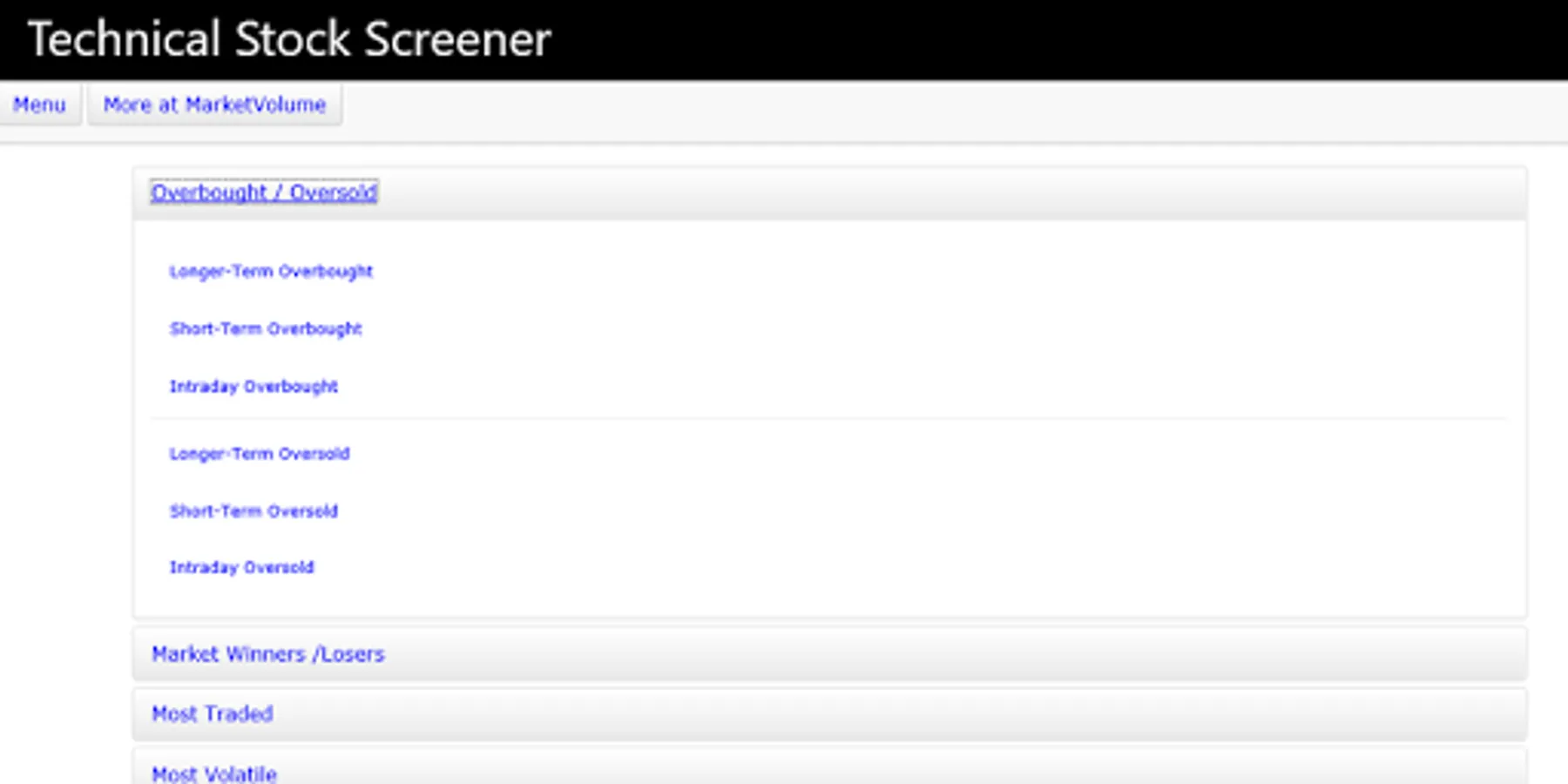 Technical stock screeners to scan the stock market and select stocks by specific technical criteria and indicators. The list of available stocks screeners includes: