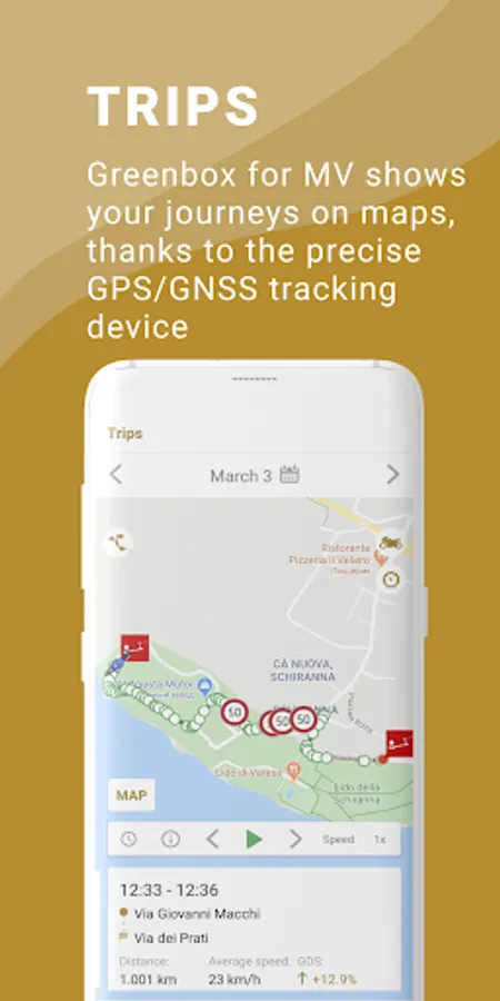 Trips log-book: Greenbox for MV shows your journeys on maps, thanks to the precise GPS/GNSS tracking device. Consult your trip data point by point in an innovative and comprehensive way. You may also consult detailed reports related to the distance traveled, driving times, speed, etc., and even watch all this data via the virtual MV dashboard.