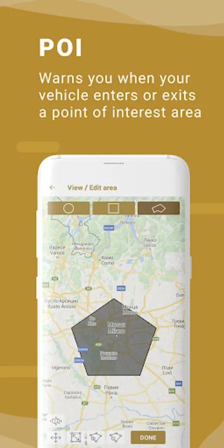 POI (Points of Interest): you can draw geographic areas on the map and ask Greenbox for MV to send you a notification every time your bike enters and leaves the area you have defined.