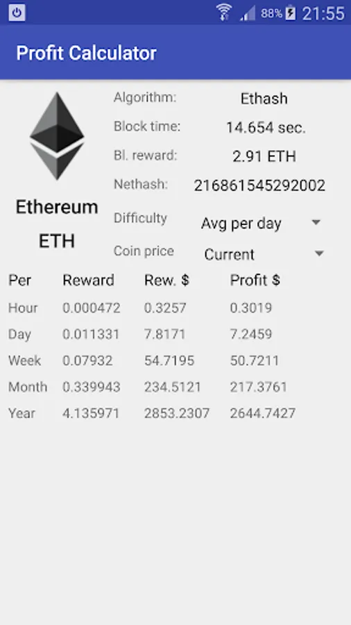 You can choose current or average (per 1, 3 or 7 days) difficulty and coin price for calculating as well. Based on calculated data the application gives the approximate prediction for the long time profit.