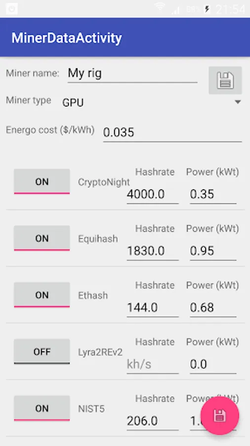 You can add any number of miners obtaining different options of hashrate, power for different algorithms and having various energy prices. After that you can get information about every coin profit on each miner.