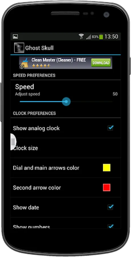- Option to choose the clock color, to show / hide date, to show / hide the clock numbers, clock size etc.