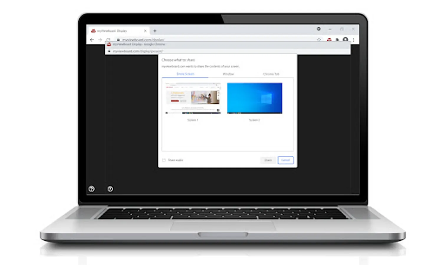 Once myViewBoard™ Display is installed on a host, users will only need to head to a browser and visit myviewboard.com/display to start sharing their screens wirelessly – no further software to install, no dongles to keep track of, no presentation hassles.