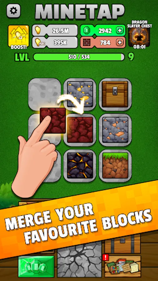 Merge the resources and build more complex materials on the workbench and forge. Become a craftsman. Mine, craft, level up! Gather stone, coal, ore and other blocks. Create precious gems, epic armor, weapons and a handy pickaxe. Build your village, fight zombies and other various monsters. Be the best among the heroes of tapping, titans of merging and legends of crafting!