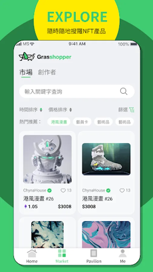 Grasshopper is an NFT trading platform under the "City Communication Group", which is also a subsidiary of "Metro Daily". It can use cryptocurrencies, and also supports fiat currency and credit card settlement for trading transactions. In addition, Grasshopper also provides a vertical service solution from minting to management of NFTs, with a simple operation interface, allowing users to easily buy and sell NFTs. Five major features: •Express transactions can be traded in Hong Kong dollars, U.S. dollars, RMB, credit cards and virtual currencies to achieve fast and secure real-time settlement. • Featured Recommendations Whether creators or artworks, they can be recommended through "Quality Creators", "Hot Collections" and "Today's Picks" to increase exposure. • The "Information Display" on the real-time information homepage will display real-time information such as transactions, creator registration, etc., allowing users to see at a glance. •Teaching for newbies To take care of novice users, we provide short video teachings of different themes, so that users can quickly learn the entire transaction process. • Keep up with the trends Market information about NFT and Blockchain is changing with each passing day. In addition to the "QUICK TIPS" on the page, which will provide practical tips, you can also access Grasshopper's information website through the App, and you can also get the latest market trends from expert analysis and related news. Four major services: • Design and casting Grasshopper has a professional design team, which will design a unique NFT according to the customer's brand image and positioning, including 2D or 3D images, GIFs and videos, and provide professional advice to create smart contracts and lead The customer takes the critical first step. • Valet listing There are many projects on the market in the form of 10K Projects. It is time-consuming to upload more than 10,000 NFTs. Grasshopper can not only be put on the shelves for customers, but also avoid any problems for everyone. If customers want to cast NFTs in real objects, our The team can also provide services such as shooting and scanning, and can also achieve cross-platform transactions, synchronizing NFTs on OpenSea, Rarible and other platforms, greatly improving exposure opportunities. • Account Management Grasshopper can also manage accounts for customers and monitor the entire process. When buyers have any questions or requests, they will immediately notify customers, and the team will provide professional advice to help solve problems. •Publicity and promotion Grasshopper has its own information platform. In addition to regularly sharing various information about NFT and Blockchain, "Metro Pop" and "Metro Pop", both of which belong to the "City Communication Group", will also fully support the Grasshopper project and assist in publicity and promotion. , to create a diversified trading platform. If you have any questions, please contact us via email cs@ghop.io!