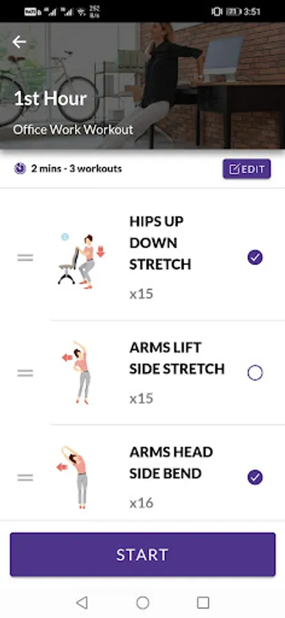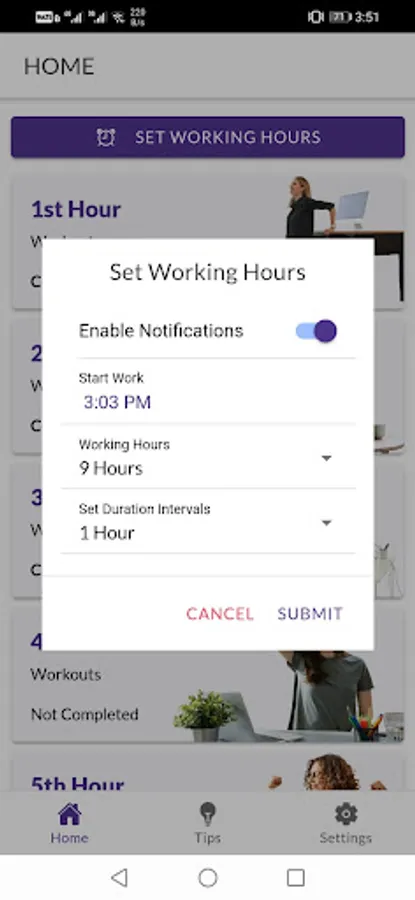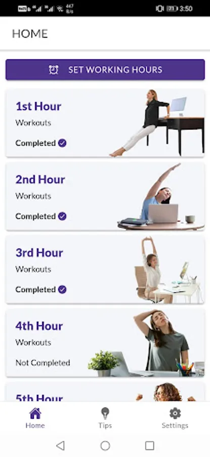 Just tell us your work schedule and we'll help you with your Office Stretch and Workout routine every hour.