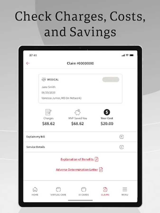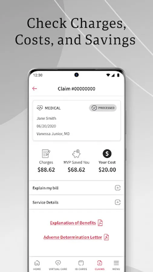 CLAIMS: Get a quick look at medical, dental, and pharmacy claims. Click on any claim to find detailed information like total charges, savings, final costs, service breakdowns, and more. Or use advanced search to find specific claims quickly and easily.
