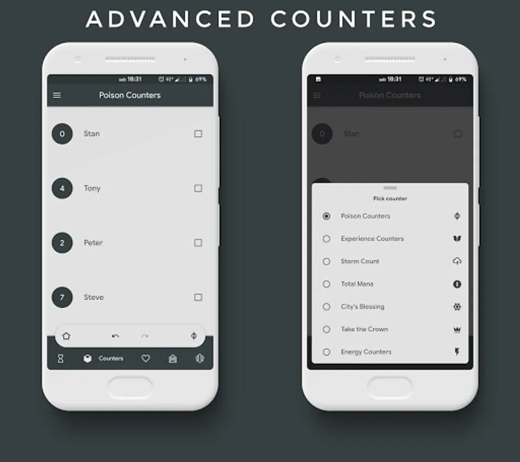 - Life, Commander Damage, Commander Casts, Poison Counters, Experience Counters, Storm Count, Total Man Tracker, City's Blessing, Monarch, and other counters to keep track of anything you could possibly need.