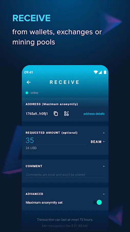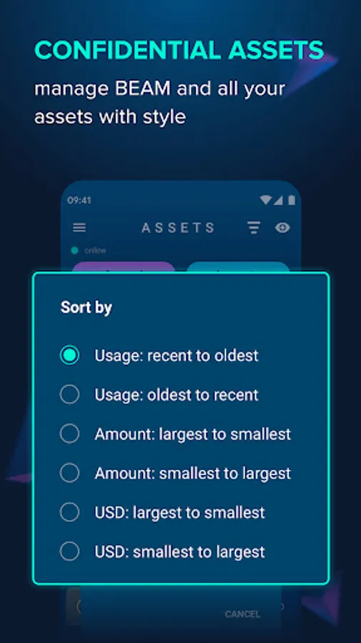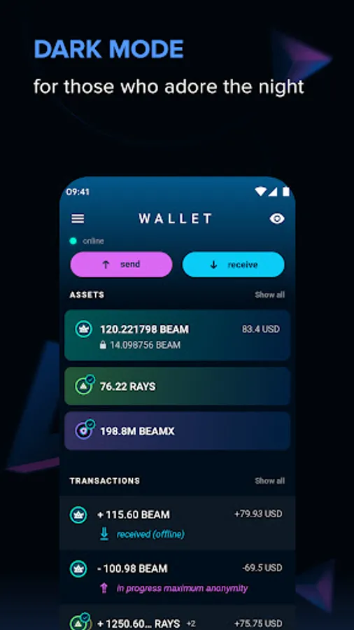 This is the official version of the Beam Mobile Wallet. The wallet allows you to conveniently manage and transact your BEAMs and Confidential Assets using alphanumeric addresses or QR codes in an easy, safe and secure manner.