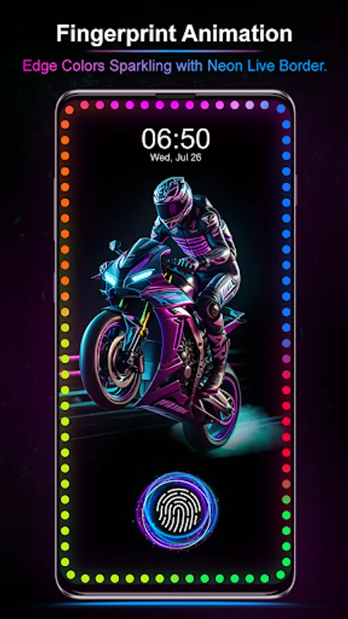 🆕Edge light live wallpaper with live fingerprint lock animation free shows a slowly moving colorful lighting border around your screen's edges. This true edge glow and borderlight 🌞 application adds beautiful curved rounded corners light on your mobile home screen and lock screen with fingerprint animation and lock screen neon wallpapers. 📱 You can customize the edge lighting as per your choice like changing the colors, adjust width, type of edge lighting border, display touch settings ⚙️, HD wallpapers, Magical EDGE Lighting, and fingerprint animations.