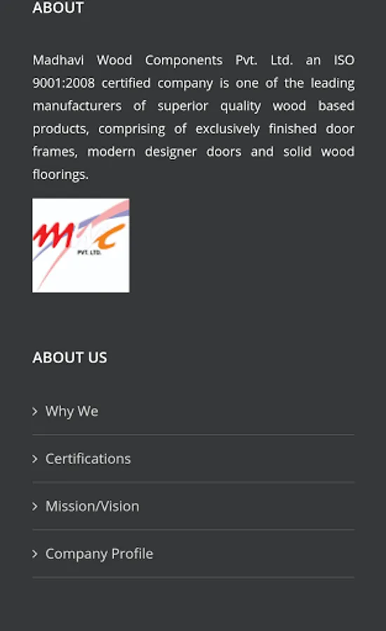Madhavi Wood Components Pvt. Ltd. an ISO 9001:2008 certified company is one of the leading manufacturers of superior quality wood-based products, comprising of exclusively finished door frames, modern designer doors, and solid wood floorings.