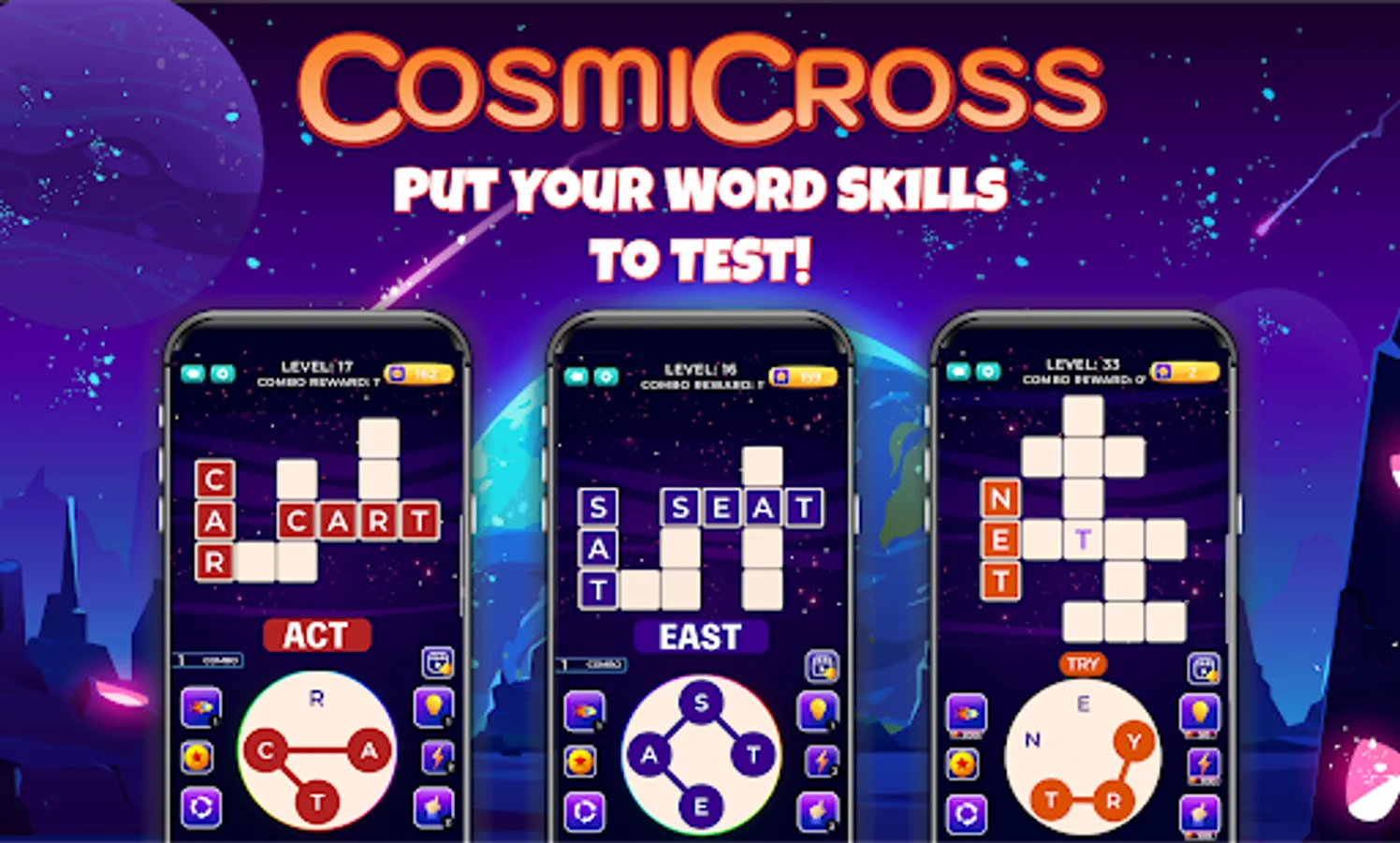 Solve crossword puzzles, Connect words and give CosmiCross the ultimate word trip of the galaxy.