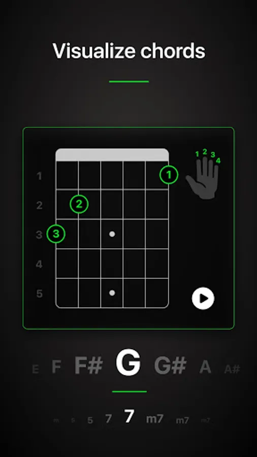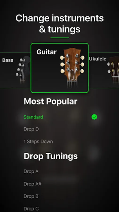 You’ll find more than a guitar tuner: 2640 chords and amazing instruments like guitar, bass and yukulele! It’s really easy to use, quick and it helps you tune accurately your guitar.