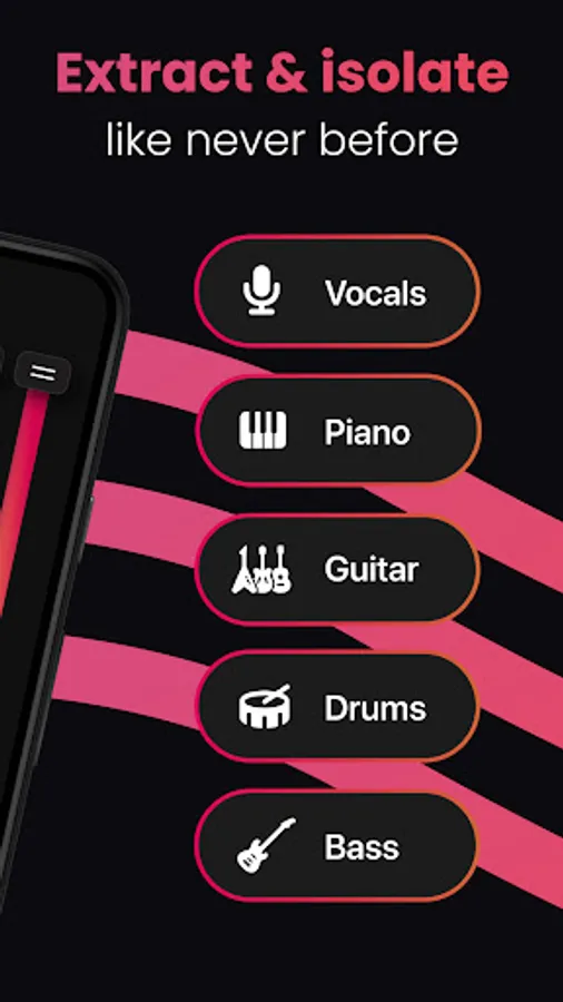- Extract, separate and isolate all the instruments: vocals, guitar, piano, drums, bass