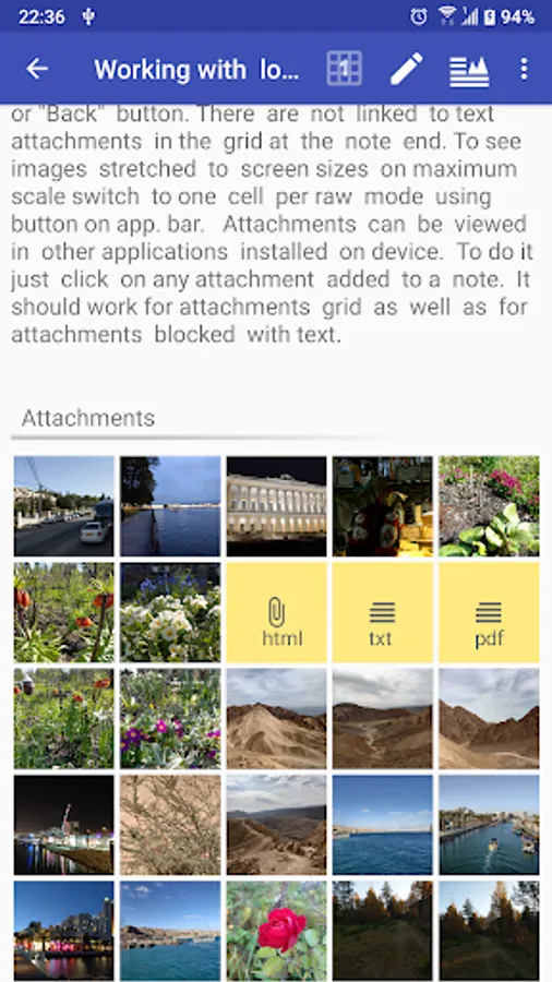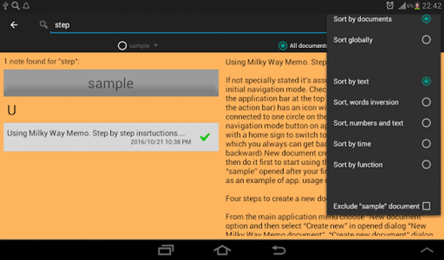 - Multiple documents support, notes search by entering key word or phrase in one document only or in multiple documents at once, copy and move notes or tree of notes between lists of the same or different documents. Text and attachments exchange with other applications installed on device.