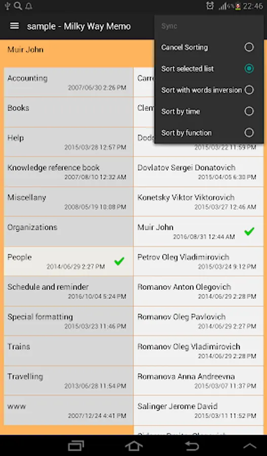 - Menu of arbitrary hierarchy creation as well as notes search tags. Speeded up access to information by references. Paging lists of notes in horizontal direction to lists deeper into hierarchy (as in a book) and vertical direction (scroll lists of notes up and down).