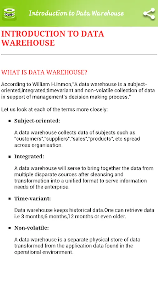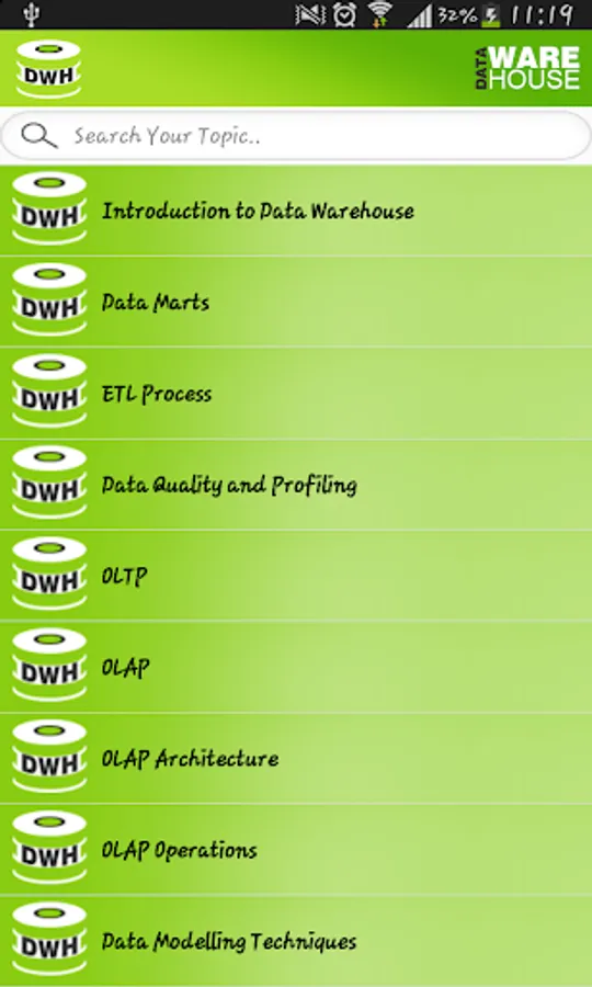 This application explains all the basic details and relevant images with all Data Warehouse topics.