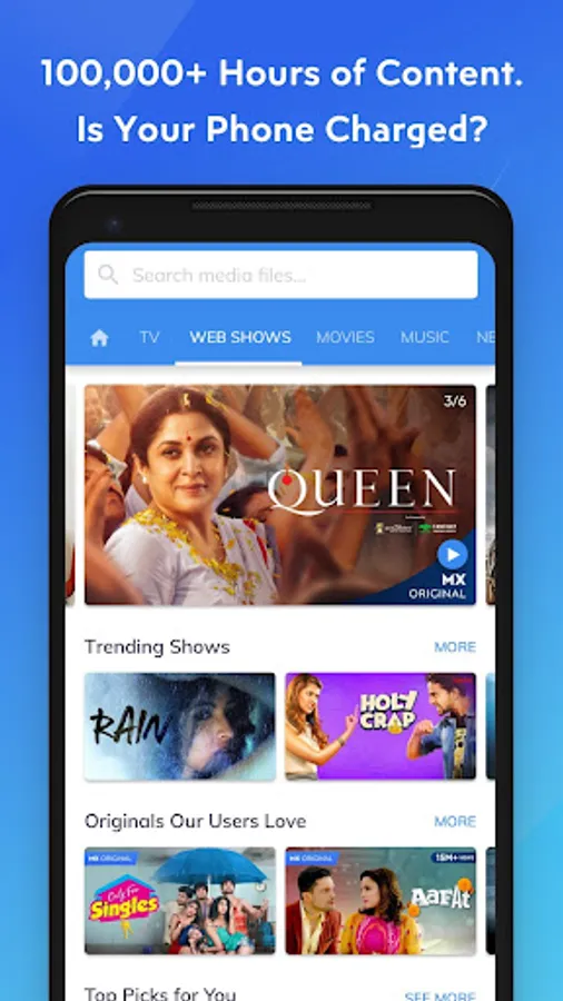 MX Player, the most powerful video player now brings you a FREE streaming service offering more than 100,000+ hours of content including Original & Exclusive Shows, Movies, TV Shows, Web Series & a dual Music experience with videos and audio.
