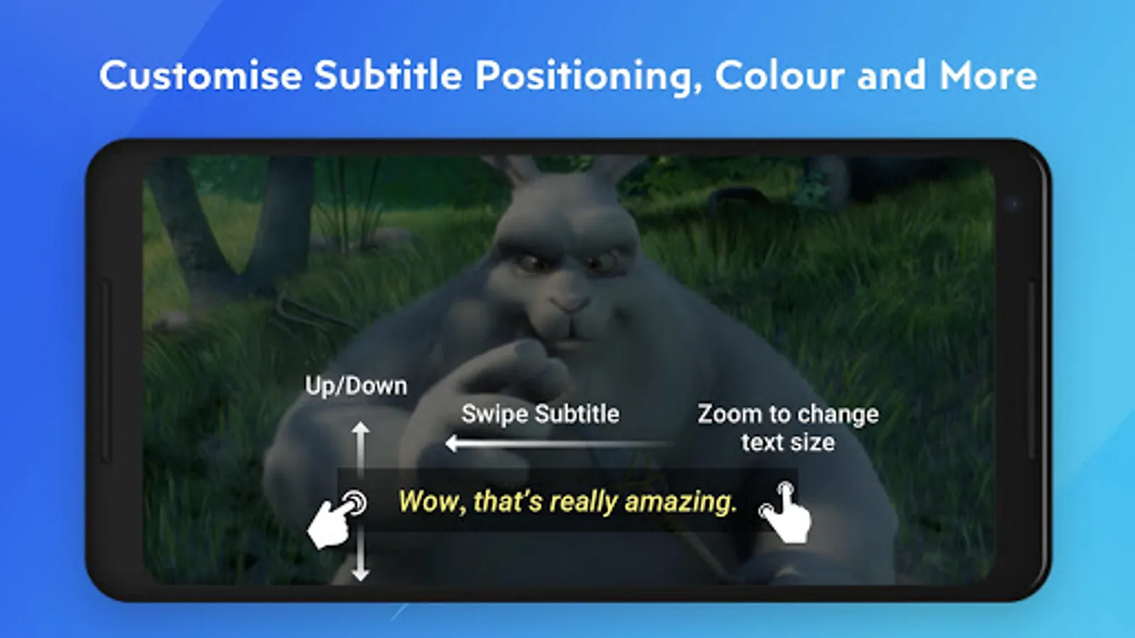 d) SUBTITLE GESTURES - Scroll forward/backward to move to next/previous text, Up/down to move text up and down, Zoom in/out to change text size.