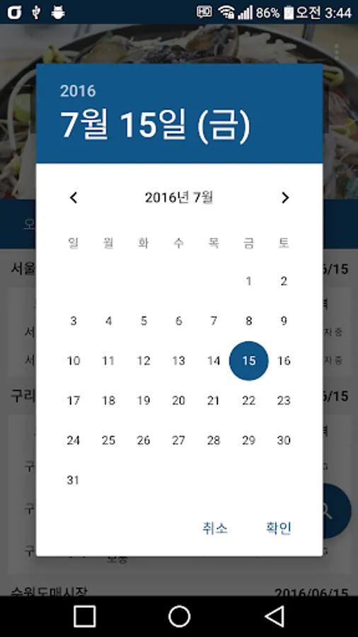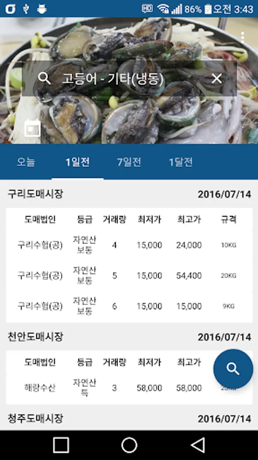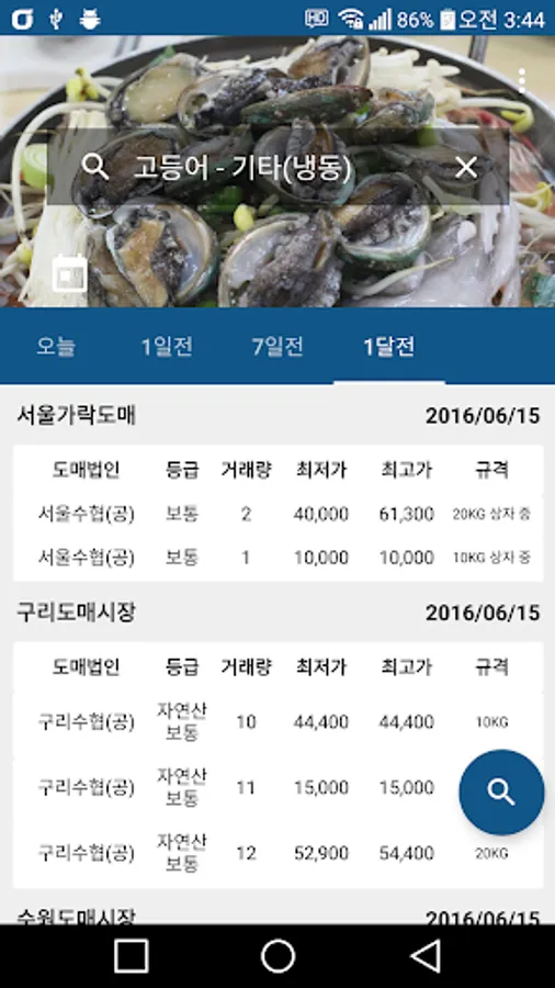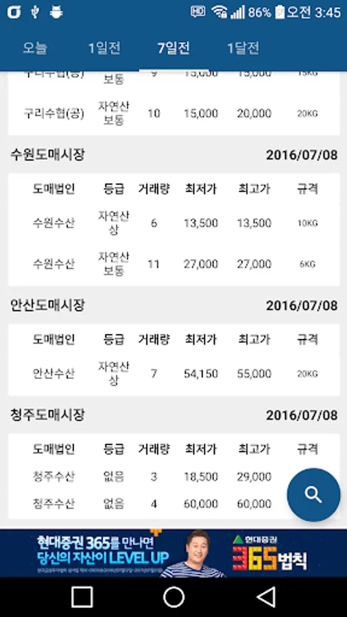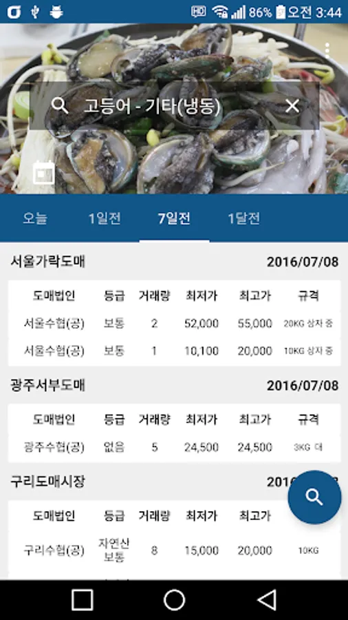 2. 지정한 날짜, 1일전, 7일전, 1달전순으로 쉽게 간단히 농산물 경매 가격을 확인 할 수 있습니다.