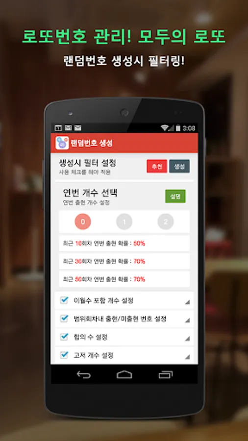 - Supports random generation by various filters (each band, even odds, excluding winning numbers, excluding numbers, transcription, etc.).