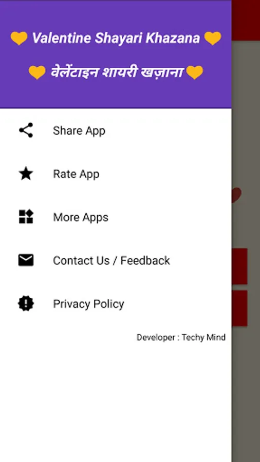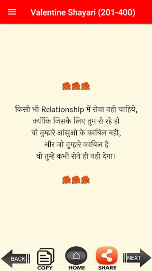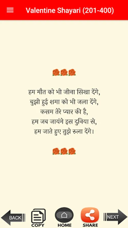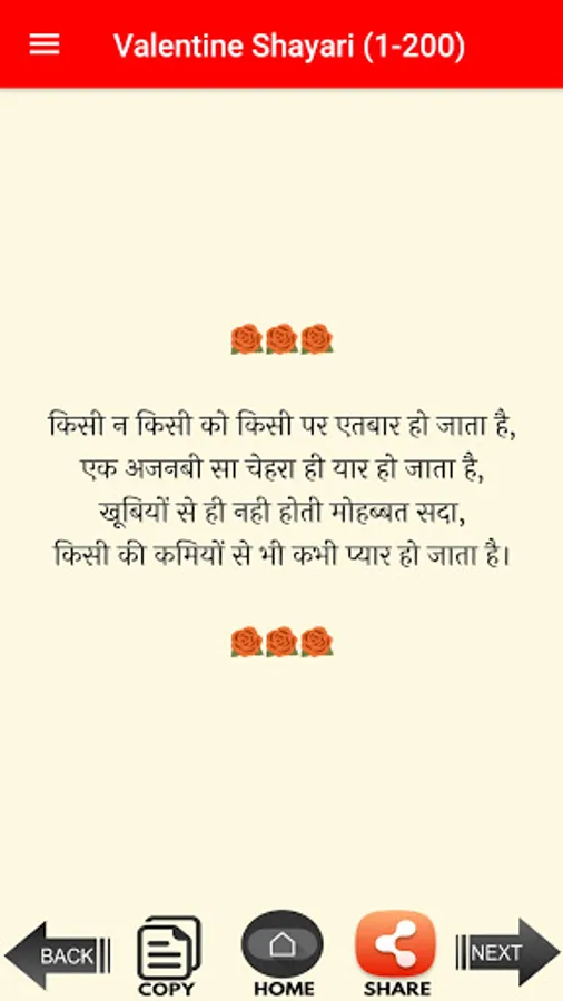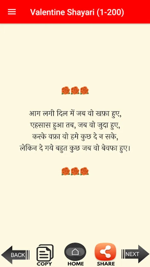 Enjoy and Share Great Collection of Valentine Shayari / Quotes in hindi / english with your bf / gf / husband / wife / your loved ones. In this app you can find so many shayari for your loved ones. In this app you can copy / share shayari to your dear ones. This app is totally offline, so use it without any hesitation. I have made this app for couples who wants to share valentine shayari with each other. Valentine Shayari Khazana contains 400 Shayari. Happy Valentine Day .