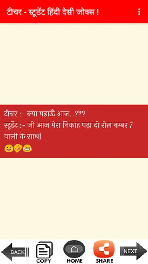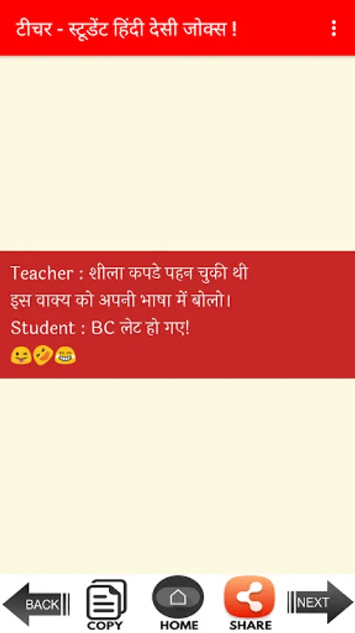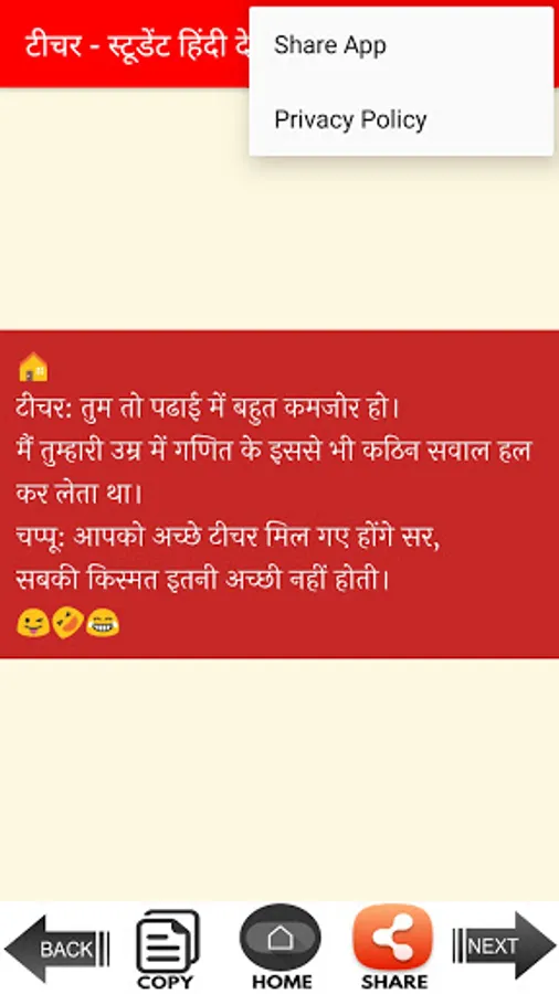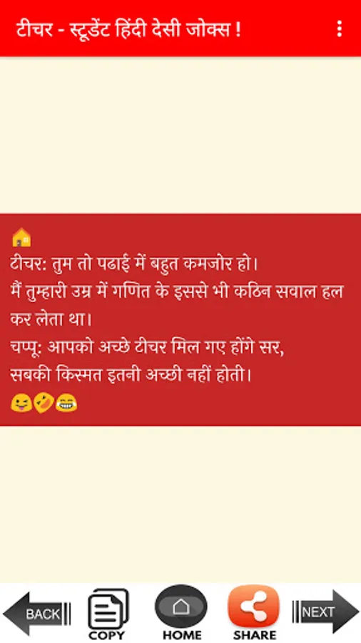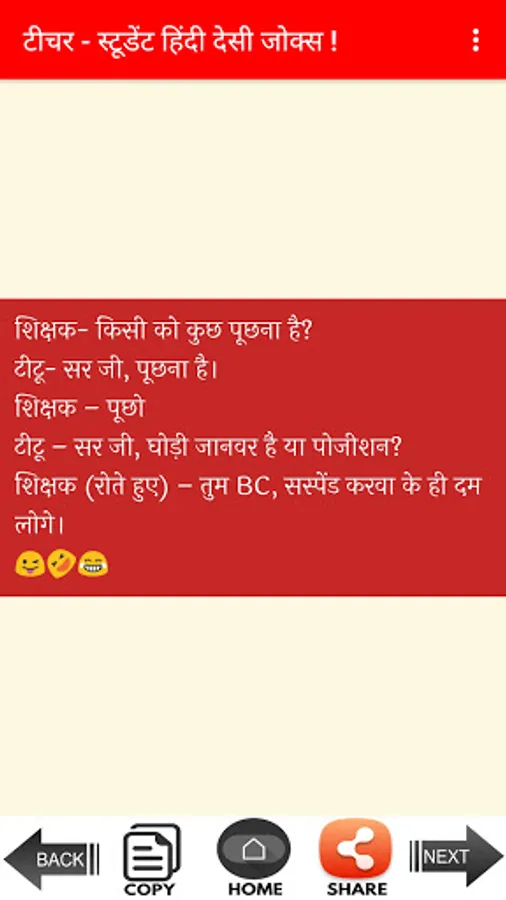 Enjoy great collection of Teacher And Student Hindi Desi Jokes | टीचर स्टूडेंट जोक्स . This is app is totally "offline", which means you can this jokes app "without internet". This application has a features of "share and copy", by use of that you can share these jokes with your friends, brother or sister, and also your school friends. Teacher Student jokes app contains all jokes in "Hindi language". You can also share and rate this application if you like it and give feedback based on your experience. Teacher Student Hindi Desi Jokes app contains "200 Hindi jokes". This app also include funny comedy jokes and online classes funny jokes.
