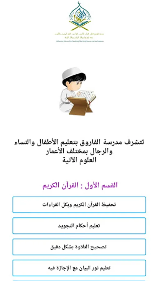 This application is a special application for Al-Farouk School, through which details about Al-Farouk School for the Teaching of the Noble Qur’an and its sciences and the scientific departments that you teach are known