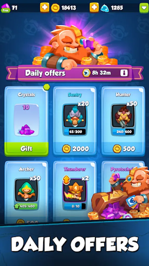 Welcome to the Isle of Rhandum - a realm of tower defense, clans, magic and mayhem! Collect units, assemble a deck for base defense and get ready for a TD game full of action, adventure and endless fun - Rush Royale!
