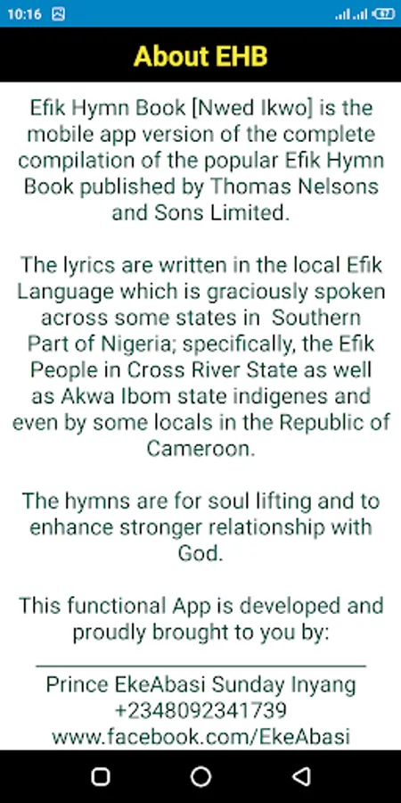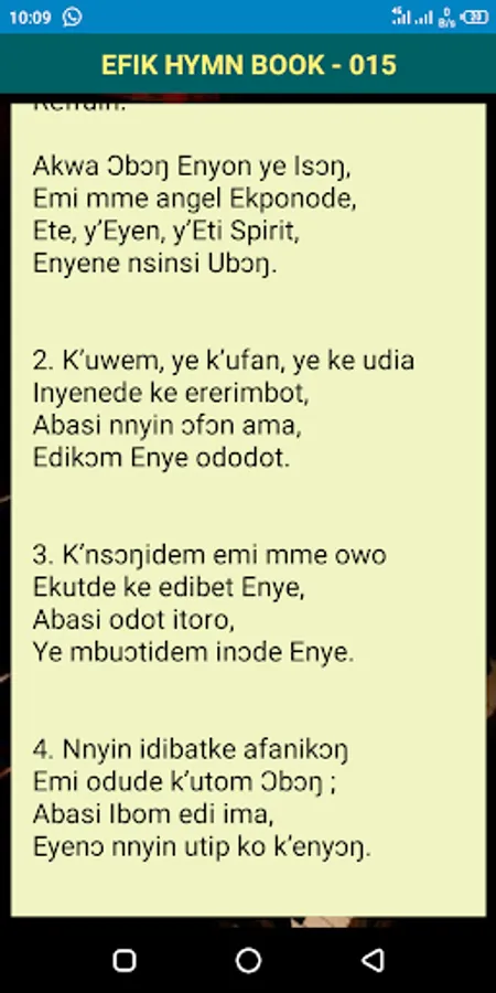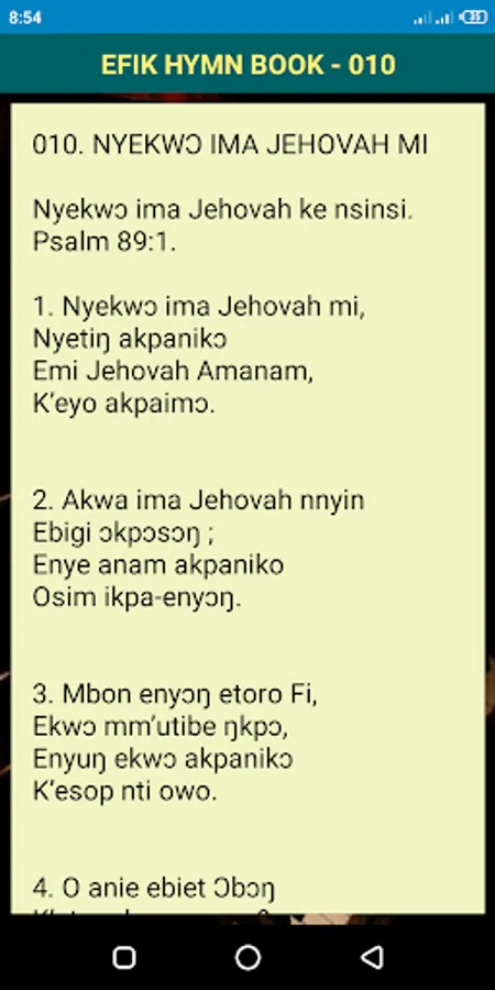 This hymn book popularly translated as "Ŋwed Ikwɔ" meaning Hymn Book is enriched with soul-lifting tunes and lyrics of great hymns in the native Efik language.
