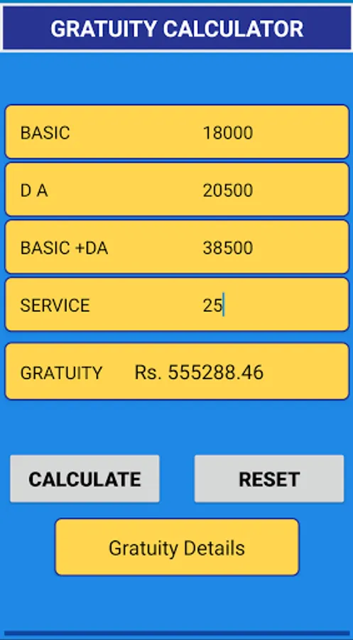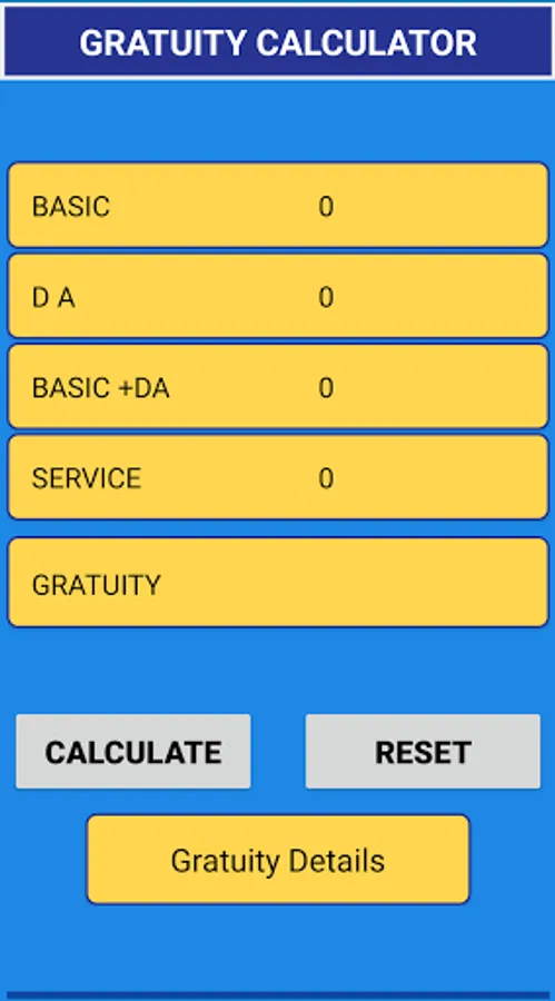 Very simple steps used to calculate your gratuity by using this "gratuity calc" application.Enter your "basic", "DA" and total Service then click on calculate button ,your total gratuity amount is displayed. Help tab is added to more about gratuity.